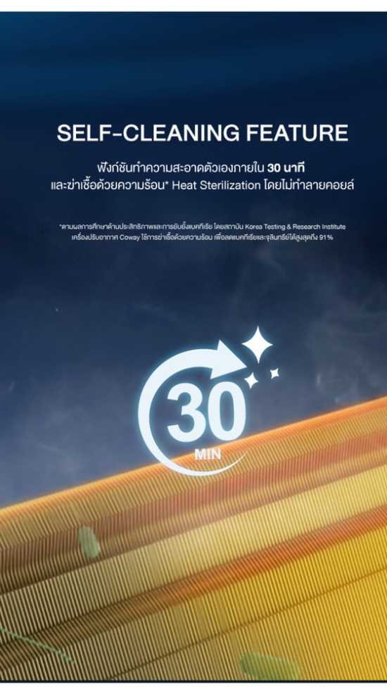 ❄ Self-Cleaning ระบบทำความสะอาดตัวเองด้วยความร้อน ลดสิ่งสกปรกและแบคทีเรียได้ถึง 91%* ภายใน 30 นาที